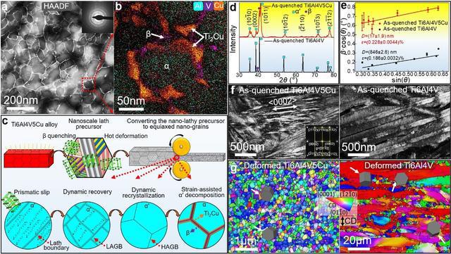 圖2 雙相蜂窩殼結構納米晶Ti6Al4V5Cu合金的組織表征與形成機制分析,(a)HAADF成像模式觀察;(b)能譜面掃描觀察;(c)雙相蜂窩殼結構形成機制示意圖;(d)XRD衍射圖譜;(e)β·cos(θ)-sin(θ)圖,添加Cu使淬火后合金內的微觀應變增大;(f)添加Cu細化了馬氏體板條;(g)添加Cu有利于合金在熱變形過程中發生柱面滑移而形成等軸晶結構。