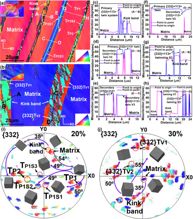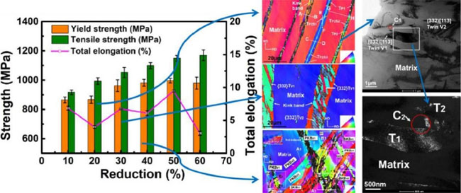 該研究揭示了亞穩(wěn)Beta鈦合金復(fù)雜的變形機(jī)制,發(fā)現(xiàn)次級(jí)變形孿晶和次級(jí)扭結(jié)帶在初級(jí)變形孿晶以及初級(jí)扭結(jié)帶中被激活,變形機(jī)制間的協(xié)調(diào)配合共同指導(dǎo)了合金力學(xué)性能。引入動(dòng)態(tài)霍爾-佩奇效應(yīng)和多尺度的變形組織強(qiáng)化效應(yīng),從變形機(jī)理上揭示了該合金冷變形能力強(qiáng)、力學(xué)性能優(yōu)異的內(nèi)在原因。