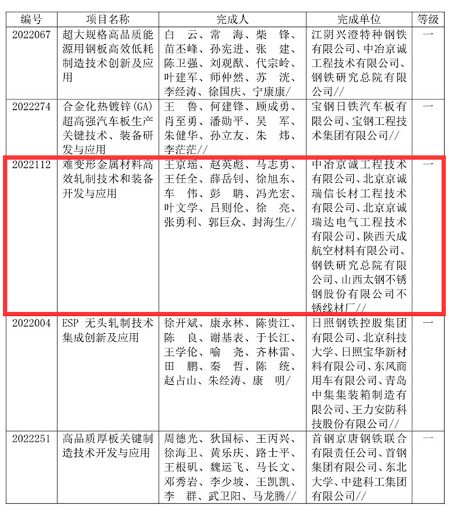 近日,2022年中國鋼鐵工業協會·中國金屬學會冶金科學技術獎(以下簡稱“冶金科學技術獎”)評審結果揭曉,經過層層選拔,天成航材“難變形金屬材料高效軋制技術和裝備開發與應用”項目榮獲一等獎。