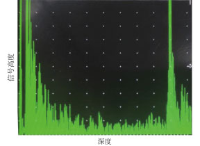 采用SonATEST 380M型超聲探傷儀、奧林巴斯V109探頭對?160 mm Ti-1023鈦合金成品棒材的超聲檢測從波形來看,噪聲水平不高于20%,噪聲均勻,無明顯缺陷信號(hào)出現(xiàn),底波變化幅度小于6 dB,噪聲水平為半聲程?1.2 –9 dB~–12 dB(圖9),表明成品棒材可滿足GB/T5193—2007標(biāo)準(zhǔn)中的A1級(jí)要求。圖9中橫坐標(biāo)代表深度,縱坐標(biāo)代表信號(hào)高度,滿屏按100%計(jì)。
