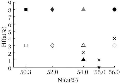 圖1 與基準Ni55Ti45和Ni54Ti45Hf1合金相比,本研究評估了摩擦學應用的富Ni的NiTiHf合金的目標成分范圍