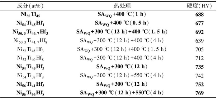 表1 NiTi和NiTiHf合金峰值時效處理后的硬度