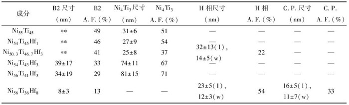 表2 峰值時效條件下在NiTi和NiTiHf合金的顯微組織中觀察到的B2基體和析出相的形貌(如第2.2節所定義的那樣:A.F.=面積分數,C.P.=立方相)