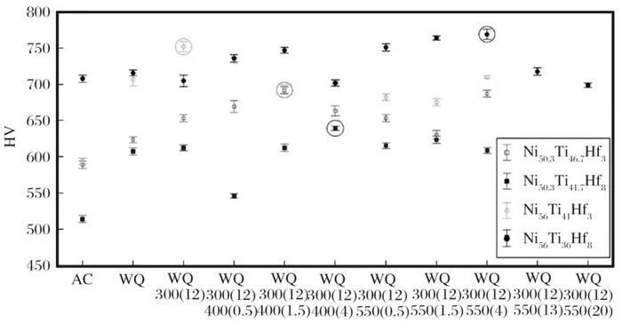圖2 所選NiTiHf合金經各種熱處理后的維氏顯微硬度。圖上圈出的是峰值(最高硬度)時效條件。誤差棒標記的是跨越平均值的標準偏差