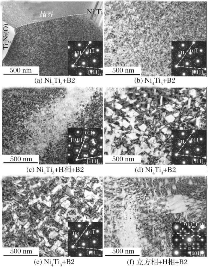 圖3 TEM明場和選區電子衍射圖顯示峰值時效合金的顯微組織:(a)二元Ni55Ti45合金中的Ni4Ti3納米析出相以及異質微尺度的Ni3Ti和Ti4Ni2(O,C)顆粒,在相應的衍射圖(插圖)中Ni4Ti3析出相用白色虛線標識;(b)Ni54Ti45Hf1合金中的Ni4Ti3納米析出相;(c)Ni50.3Ti46.7Hf3合金中的Ni4Ti3納米析出相和H析出相,在相應的衍射圖(插圖)中H析出相用白色箭頭標識;(d)Ni54Ti43Hf3合金中較大的塊狀等軸Ni4Ti3析出相;(e)Ni56Ti41Hf3合金中的塊狀等軸Ni4Ti3析出相;(f)Ni56Ti36Hf8合金中的細納米立方相和H析出相,在相應的衍射圖(插圖)中立方析出相用白色框標識