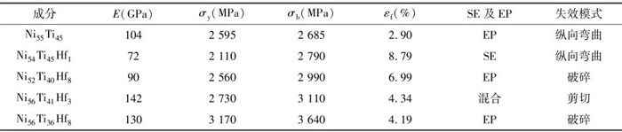 表3中失效模式的研究結果顯示出有趣的趨勢:Hf的增加似乎比Ni的增加會使合金更顯著地脆化,因為觀察到2種含8 at%Hf的合金均出現了脆性破斷,盡管Ni含量(一個是52 at%,另一個是56 at%)相差很大。同樣,無或低Hf含量的合金(Ni55Ti45和Ni54Ti45Hf1)因發生了縱向彎曲,而在斷裂前停止了試驗。Hf含量中等的Ni56Ti41Hf3合金即使也含56 at%Ni, 但在相對加載軸約45°的平面(最大剪切面)上也斷裂成2塊。