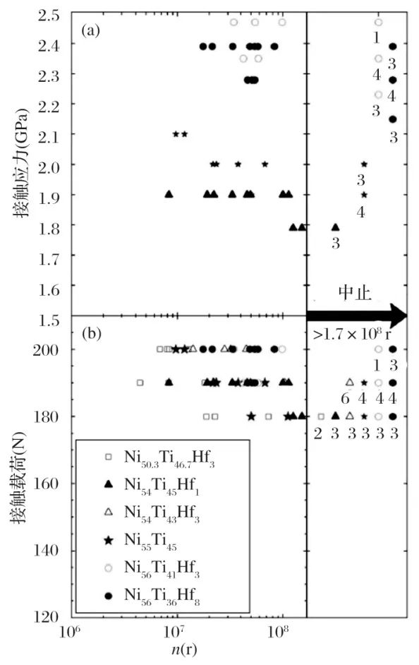 圖5 富Ni的NiTi和NiTiHf合金在峰值時效條件下的RCF試驗結果(表1):(a)Hertz接觸應力(GPa)與失效循環次數(log10)的關系;(b)接觸載荷(N)與失效循環次數(log10)的關系。圖右側標示了運行到中止時的樣品數