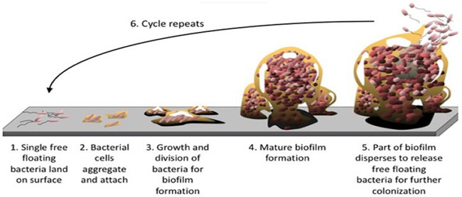 細菌的傳播與細菌生物膜的形成密切相關,細菌生物膜的形成過程如圖1所示。浮游細菌在材料基體著陸后生長和繁殖,形成細菌生物膜。生物膜表面是一層致密的細胞外基質,這層細胞外基質結構堅固,強度高,內部包裹的細菌接觸緊密,增強了細菌之間的相互作用和物質交換,同時避免外部破壞物質進入。所以生物膜形成后不易受到抗生素、防腐劑及其他外界化學品的干擾,因此很難被常用的抗生素清除掉。