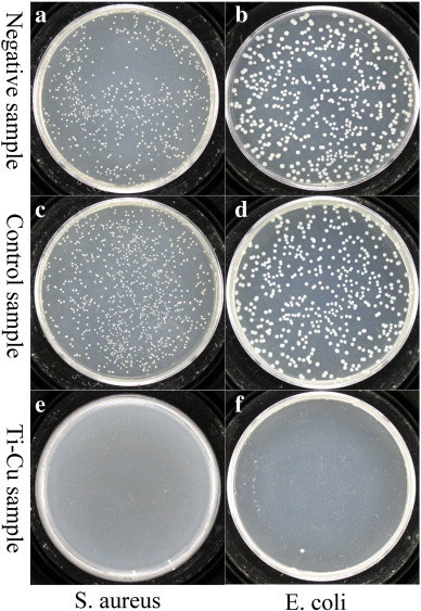 圖3 Ti-10Cu對黃金葡萄球和大腸桿菌的殺滅效果