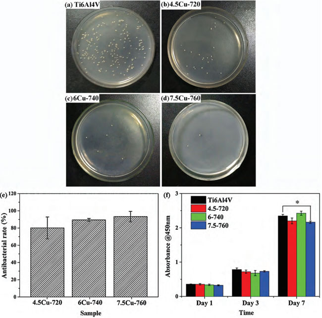 Peng等對熱加工后的Ti6Al4V-xCu(x=4.5,6,7.5)合金進行了綜合性能優化。研究結果表明,為使合金獲得最佳的力學性能、耐腐蝕性能和耐磨性能,三組合金熱加工后的最佳熱處理工藝分別為在720℃、740℃和760℃保溫1h后空冷,在圖4中分別用4.5Cu-720、6Cu-740和7.5Cu-760表示。三組合金的抗菌試驗和細胞毒性試驗結果如圖4所示,由圖4(a)-(d)可知,與Ti6Al4V合金共培養后的細菌菌落較多,而與Ti6A14V-Cu合金共培養后的細菌菌落數較少,表明含銅鈦合金具有較強的抗菌性能。圖4(e)為Ti6Al4V-xCu合金的抗菌率,可見4.5Cu-720樣品的抗菌率約為80%,隨Cu含量增加,合金的抗菌率略有上升,表明抗菌性能有所提高。由圖4(f)可知,與細胞共培養1天和3天時,Ti6A14V-Cu合金與Ti6A14V合金的吸光度值差別不大;但在7天時,7.5Cu-760的數值顯著低于Ti6A14V合金,表明其在7天時具有一定的細胞毒性。由此可見,對于Ti6A14V-xCu合金,Cu含量應不高于6%,否則在較長時間后,合金會呈現出一定的細胞毒性。