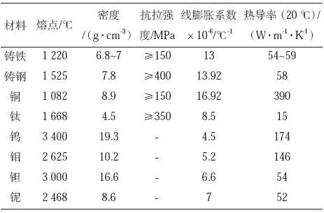 目前可用于鑄型材料的金屬主要包括鑄鐵、鑄鋼、鑄銅以及部分難熔金屬,其主要物理性能見表1。