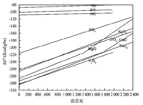 選擇涂層材料的主要原則是:粉末材料要具有較高的耐火度、抗熱震性和良好的保溫性或良好的導熱性,與鈦液發(fā)生較小的界面反應,因此,從常用的鑄鈦用耐火氧化物中選取涂層材料。難熔氧化物結合自由能與溫度關系見圖1。由圖可知,各種氧化物材料按其對熔融鈦合金的化學穩(wěn)定性由低到高排列的順序為:SiO2、MgO、Al2O3、ZrO2、CaO、ThO2、Y2O3。因此,試驗選擇Y2O3作為陶瓷涂層材料。