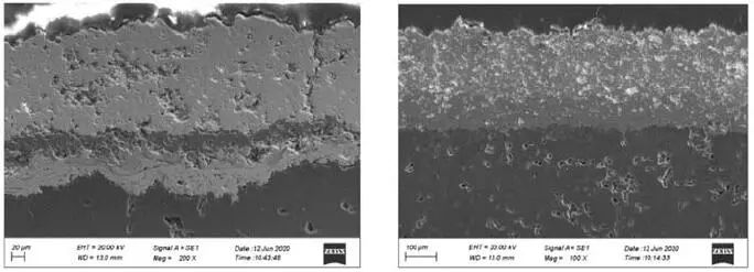 圖3為金屬鑄型表面不同涂層工藝的縱向金相組織形貌,圖3a為采用人工涂刷方法制備的涂層,可以看出,陶瓷層與金屬基體界限明顯,局部有分離的現象,這主要是由于人工涂刷制備的涂層通過物理方式結合,經過高溫燒結后,涂層陶瓷化產生應力收縮,與金屬基體發(fā)生不匹配現象。陶瓷內部縱向襯度變化明顯,這是由于涂料反復涂刷,涂刷方向、凝固時間及微觀固相含量不一致所導致。陶瓷層內分布著孔隙和縱向微裂紋,孔隙的形成主要是因為涂料在涂刷時卷吸溶解在涂料中的環(huán)境氣體未能及時完全溢出,這些氣體留在了干燥的涂層層狀結構中,形成了大量的孔隙,縱向微裂紋由于焙燒過程中陶瓷涂層釋放大量的熱應力造成的。微觀孔隙和裂紋是涂層中的應力集中區(qū),極容易造成裂紋的產生并加速裂紋的擴展,成為金屬基體元素擴散的通道,加速涂層與金屬基體受到的化學侵蝕,進而降低涂層強度,加速氧化物的生長,最終導致涂層的失效。圖3b為采用等離子噴涂方法制備的涂層,可以看出,陶瓷層與粘結層、粘結層與金屬基體之間的界面處結合都比較好,沒有明顯的裂紋存在,涂層組織較為致密。