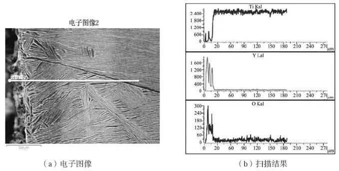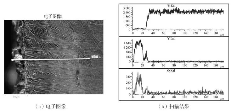為了分析涂層金屬型工藝對鈦試樣表面質量的影響,對試樣表面污染層進行了掃描電鏡線掃描分析,如圖4和圖5所示。由圖可知,人工涂刷涂層的金屬型澆注的鈦合金試樣表層出現了一定程度的Y元素和O元素的擴散,擴散厚度約10 μm,這主要是由于人工涂刷涂層結合性和穩(wěn)定性較差,孔隙和微觀裂紋部位易與鈦液發(fā)生反應,導致鈦液被污染。而采用等離子噴涂涂層的金屬型澆注的鈦合金試樣表面未出現Y元素和O元素的擴散。上述分析表明,等離子Y2O3涂層可以較好的阻隔金屬材料與熔融鈦液發(fā)生化學反應。