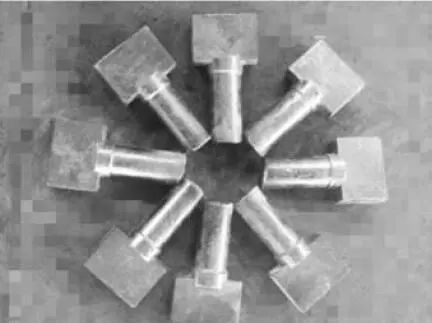 本試驗采用上述涂層工藝澆注制備了舵軸鑄件, 金屬鑄型分成兩塊組裝而成, 主體材料選用4Cr5MoV1Si熱作模具鋼,鑒于該鑄件結構不太復雜,尺寸不大,未采用鑲塊、底座和導軌結構,模具緊固采用45#鋼螺栓緊固,金屬型模具見圖6。為了增強金屬基底與涂料之間的結合強度,對金屬型進行除銹、除油處理后,吹16~24目的棕剛玉砂,吹砂時間5 min,以保證涂層和基體的良好結合。鑄造充型離心轉數為250r/min,澆注的鑄件進行清型、切割澆冒系統(tǒng)、噴砂處理和HIP處理后進行了質量分析。