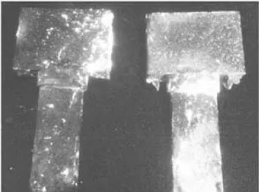 圖9為兩件舵軸鑄件的熒光照片對比圖,左邊是人工涂刷涂層金屬鑄型澆注的鑄件,右邊是等離子涂層金屬鑄型澆注的鑄件。由圖可知,左邊鑄件有明顯的線性缺陷,是表面的微裂紋。右邊的鑄件表面質量則較好,沒有明顯缺陷。