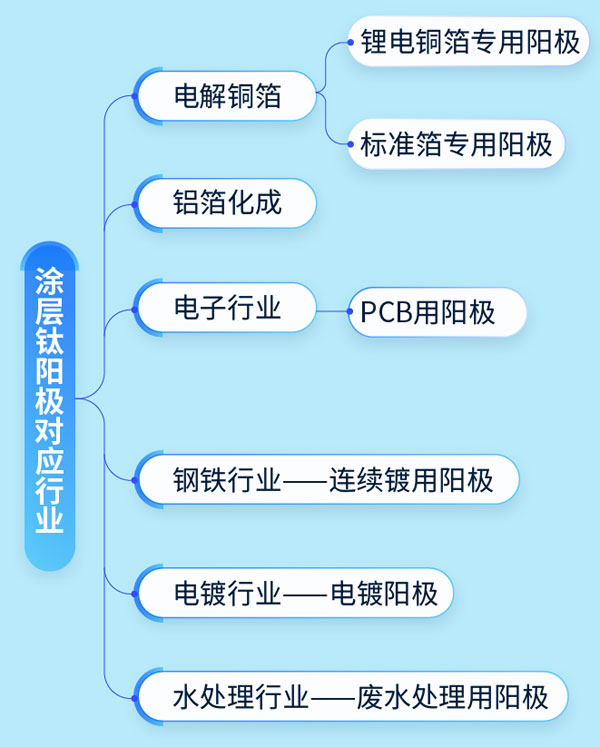 涂層鈦陽(yáng)極是許多工業(yè)電化學(xué)系統(tǒng)或裝置中的核心部件,主要應(yīng)用在電化學(xué)和電冶金兩大領(lǐng)域,最早用于氯堿工業(yè),現(xiàn)已廣泛應(yīng)用于化工、電冶金、金屬箔生產(chǎn)、水處理、環(huán)保、電鍍、電解有機(jī)合成、陰極保護(hù)、電滲析及其它領(lǐng)域。