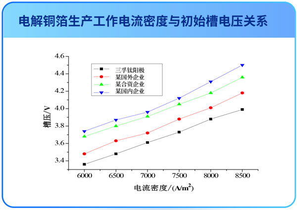 通過(guò)增大鈦基體宏觀及微觀粗糙度,優(yōu)化涂層配方及制備工藝,提高涂層催化活性表面積,降低真實(shí)電流密度,降低涂層膜電阻及電化學(xué)反應(yīng)電阻,使電解銅箔生產(chǎn)槽電壓降低。我司陽(yáng)極槽電壓低于同行陽(yáng)極產(chǎn)品0.15V左右;根據(jù)生產(chǎn)電流不同,每單機(jī)列每年可節(jié)省電能消耗4.1~5.9萬(wàn)度電。