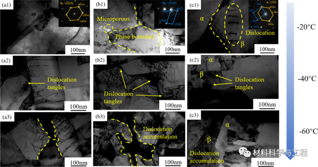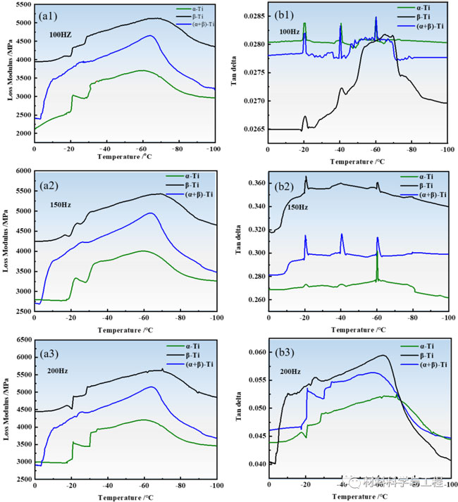 Fig. 3典型鈦合金在200 Hz不同溫度下的圖像:(a1) ~ (a3) α-Ti;(b1) ~ (b3) β-Ti;(c1) ~ (c3) (α+β)-Ti。