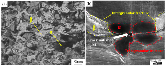 Fig. 2 (α+β)-Ti低溫200 Hz簡諧振動傳播路徑:(a)雙相鈦合金顯微組織BSE圖像;(b) (α+β)-Ti 200 Hz時的裂紋擴展路徑。