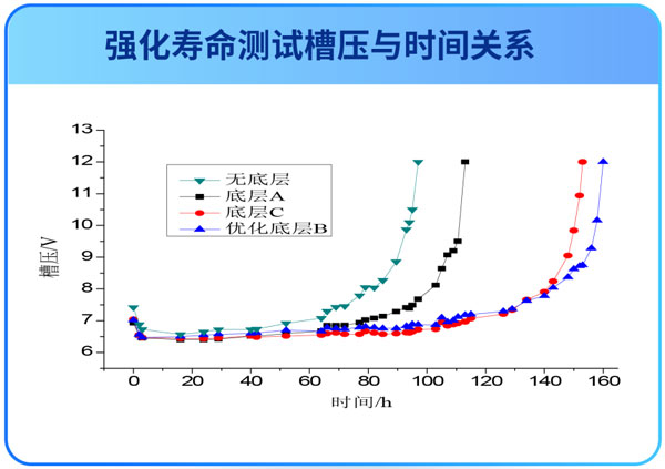 其次,陽極涂層如何達到壽命要求,主要依靠實際使用條件,以及客戶預期壽命要求等具體情況綜合考慮。決定貴金屬含量多少,不只是根據陽極過電量多少進行簡單轉化,還需要根據使用條件,例如藥水中有機物含量的多少,是否具有嚴重影響陽極壽命的物質存在,設備是否具有設計缺陷導致的陽極無法正常工作等多種因素確定。如果對涂層結構設計進行優化,也能在一定程度上降低貴金屬消耗率,選擇適合的涂層設計方案比簡單規定貴金屬含量更為符合實際和更為重要。