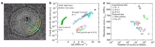 中國科學院力學研究所非線性力學國家重點實驗室微結構計算力學課題組以航空發動機用TC17鈦合金和增材TC4鈦合金為研究對象,揭示疲勞載荷過程中形成的形變孿晶和納米晶是鈦合金超高周疲勞裂紋萌生和演化的重要因素(圖1),提出鈦合金超高周疲勞裂紋萌生和初始擴展機理(圖2);研究通過變幅加載設計,測得超高周疲勞裂紋萌生和初始擴展區域的等效裂紋擴展速率在10-13~10-11 m/cyc量級(圖3a和3b),進而對超高周疲勞壽命進行預測,預測結果與實驗結果吻合(圖3c)。