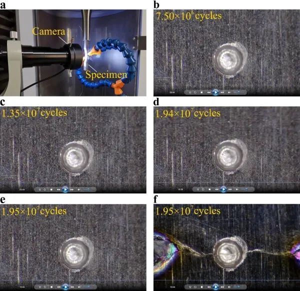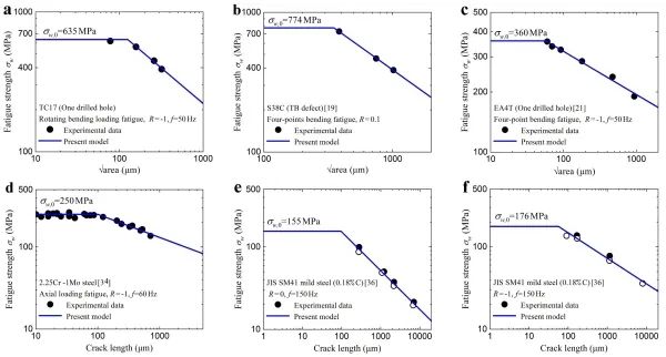 研究發現,材料缺陷不僅會顯著降低鈦合金的疲勞性能,而且缺陷對高周及超高周疲勞行為的影響與缺陷的引入形式密切有關。對于材料內部缺陷,高周和超高周疲勞S–N曲線呈現連續下降特征,而表面人工缺陷試樣S–N曲線具平臺區特征(圖4)。原位顯微鏡、掃描電子顯微鏡和透射電子顯微鏡觀測表明,與內部缺陷誘導的超高周疲勞失效不同,表面人工缺陷誘導的超高周疲勞未呈現緩慢的、隨納米晶粒形成的裂紋萌生和初始擴展過程,一旦裂紋萌生,裂紋將快速增長,試樣在很少周次內失效(圖5)。科研人員認為這種失效是疲勞載荷與時間相關過程(如水氣影響、氫的作用等)的協同作用所致。研究進一步提出試樣幾何形狀及表面缺陷對鈦合金高周和超高周疲勞強度的影響模型。該模型不但可用于關聯缺陷對鈦合金疲勞強度的影響(圖6a),而且有效用于文獻中缺陷(包括裂紋)對一些金屬材料高周疲勞強度的影響(圖6b-6f)。