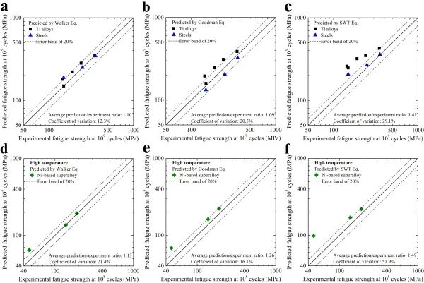 科研團隊對幾種常用的應力比對高周疲勞強度影響模型在超高周疲勞范疇的預測 能力進行了對比研究。多種材料實驗數據表明,Walker公式σα,R=σα,-1[(1–R)/2]γ相比Goodman公式σa,R=σα,-1[1–(σm/σb)]及Smith-Watson-Topper公式σa,R=σα,-1 [(1–R)/2]1/2,更好地預測應力比對超高周疲勞強度的影響(圖7),其中σα,R和σα,-1分別是應力比R和–1下的疲勞強度,σm和σb是平均應力和拉伸強度,γ是材料參數。
