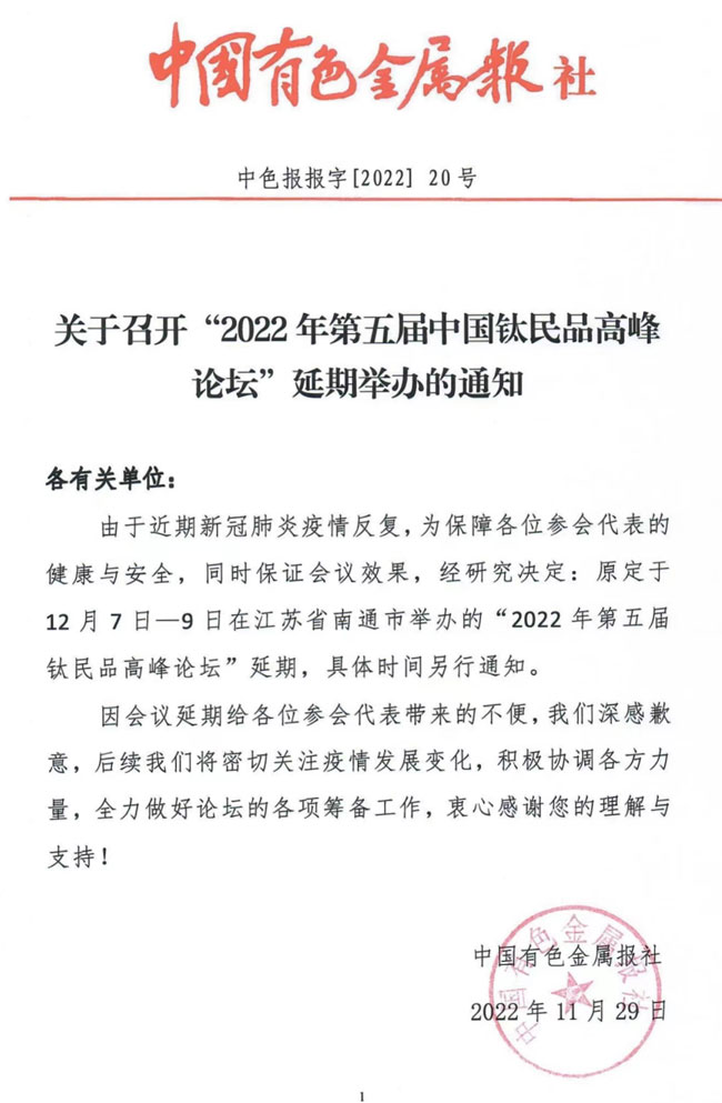鑒于以上兩點,經研究決定,原定于12月召開的“2022年第五屆中國鈦民品高峰論壇”延期至2023年適時舉辦,具體時間另行通知。