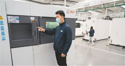 工作人員在位于西安高新區的鉑力特金屬增材制造智能工廠項目車間內操作3D打印設備