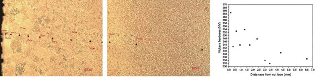 圖4 3000W 功率、O2 輔助條件下激光切割25mm 厚試料熱影響層維氏硬度檢測情況