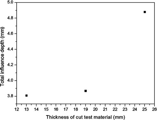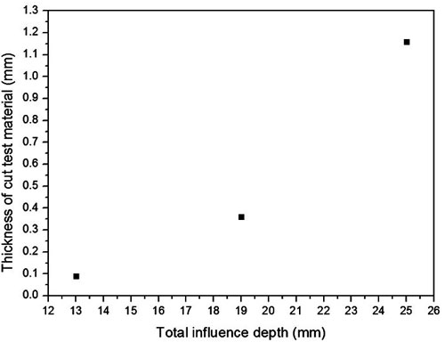 圖5 3000W 功率、O2 輔助條件下激光切割不同厚度試料與總影響層深度對應關系
