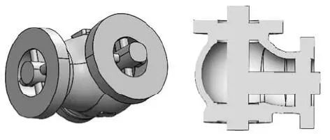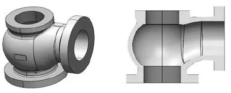 圖1為該閥體鑄件結構圖,內部中空,最薄壁厚約為38 mm,鑄件除法蘭為平直、環形面外,其他區域均為曲面;上下端兩法蘭同軸心,但尺寸相差約150 mm;右側法蘭軸心與上下端法蘭軸心垂直,連接處存在一定弧度,整體結構較為簡單。