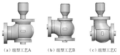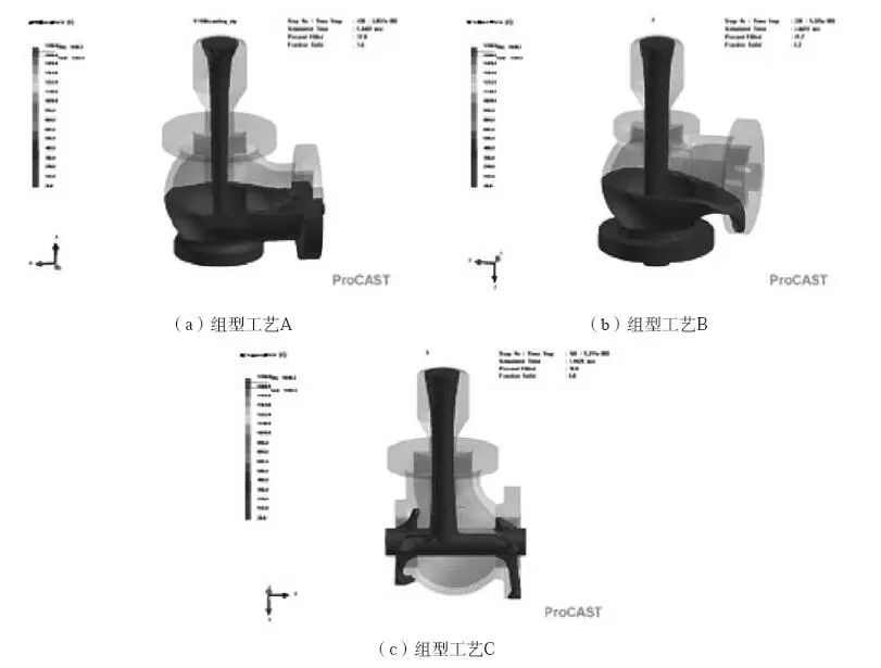 在內澆道設計完成后,分別采用了三種不同組型工藝,如圖3所示,其中澆注工藝A和B均將兩同心法蘭與澆杯相連,區別在于與杯口相連的法蘭面尺寸不同。由于兩法蘭尺寸相差較大,造成金屬液充型時間不同,因此鑄件的凝固過程也會產生較大的差異。