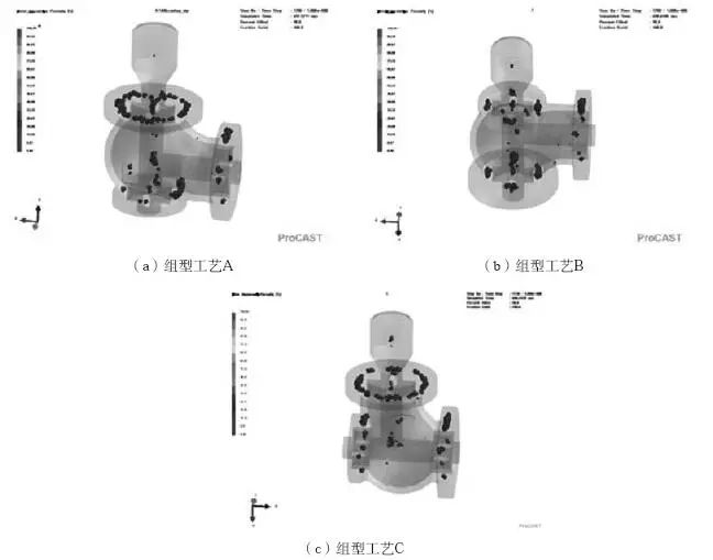 鑄型充型順序如圖4所示,組型工藝A和B相同,金屬液自下而上充型平穩、迅速,并未發現金屬液的飛濺與紊流現象產生。而組型工藝C由于內澆道位置的變化,金屬液由橫澆道向鑄件兩側分流,導致金屬液在鑄型內產生對向金屬液沖擊,產生了一定成度飛濺,而且對沖的金屬液極易產生卷氣、夾雜等缺陷。