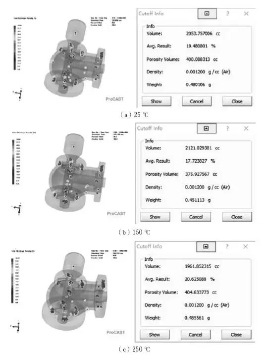 圖6 三種鑄型溫度下鑄造模擬缺陷體積