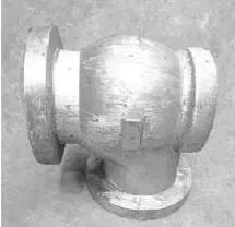 采用600 kg容量鈦合金真空自耗電極凝殼爐,對該鈦合金鑄造閥體進行熔煉澆注,澆注工藝采用重力澆注,鑄形預熱溫度為150 ℃。實際鑄件如圖7所示。整體成形完整,尺寸精度高,內外表面均無明顯冷隔、流痕等缺陷;通過X射線檢測,發現內部缺陷位置與模擬結果基本一致,主要位于法蘭與內澆道連接處,且較為集中。