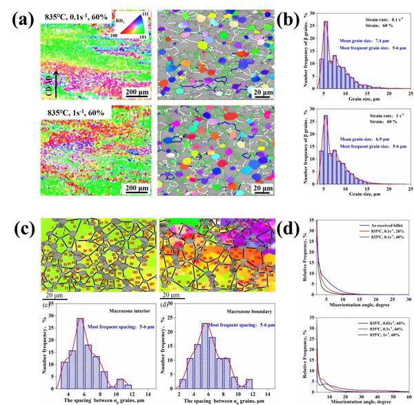 此外,鈦合金鍛造組織中的微織構在后續熱加工過程中具有較強的“頑固性”,主要表現為原始β晶粒的晶體取向很難隨機化,甚至后續經過十幾火次的反復鐓拔變形也很難消除。本團隊通過對TC17合金雙態組織中微織構演化規律的研究(圖2),發現初生圖片相的釘扎作用是導致原始β晶粒的晶體取向表現出強“頑固性”的主要原因。初生圖片相的釘扎作用限定了β晶粒生長,有利于β晶粒尺寸的均勻化,但也阻礙了β亞晶的聚合過程,限制了原始β晶粒取向的隨機化。研究團隊通過分析β晶粒內亞結構隨變形參數的演化規律,討論了在初生圖片相釘扎作用下各變形參數對β相晶體取向的影響,為理解鈦合金具有較強組織遺傳性的機制提供了新視角。