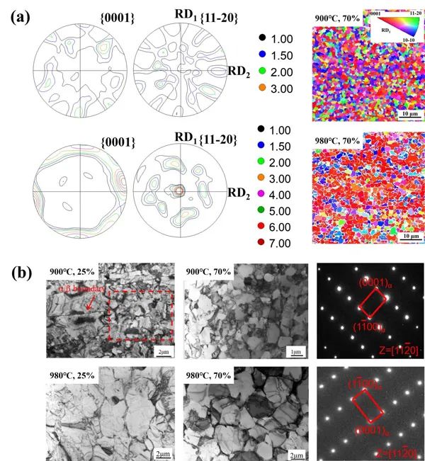 圖1 α相的球化機制與微織構的形成聯系:(a)不同變形溫度試樣宏觀織構及α相晶體取向分布差異;(b)不同溫度變形時α相球化機制的差異