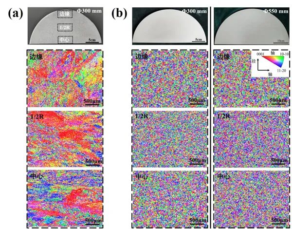 圖3 鍛造工藝優化前后棒材晶體取向對比:(a)優化前Φ300mm棒材低倍組織及其晶體取向;(b)優化后Φ300mm和Φ550mm棒材低倍組織及其晶體取向