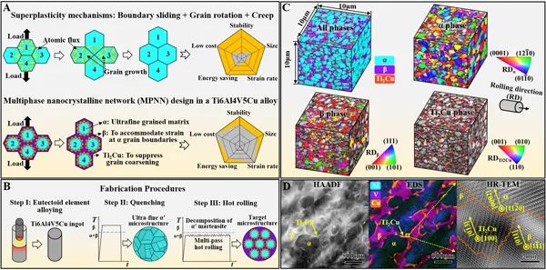 圖1. 多相納米網狀超塑性鈦合金的組織設計、制備與表征。(A)組織設計思路。(B)材料制備流程。(C)初始態組織的EBSD表征結果。(D)初始態組織的高分辨TEM觀察。
