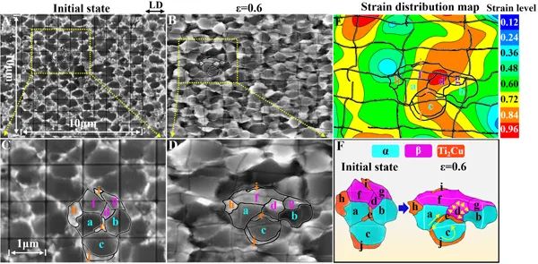圖2. 原位SEM觀察高溫拉伸過程中材料的超塑性變形機制。(A-D)SEM組織演變。(E)應變分布圖。(F)晶粒滑移與傾轉機制的示意圖。