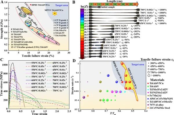圖3. 多相納米網狀Ti6Al4V5Cu合金的力學性能。(A)室溫拉伸性能。(B)高溫拉伸性能。(C)高溫拉伸應力-應變曲線。(D)不同材料的超塑性變形能力對比圖。