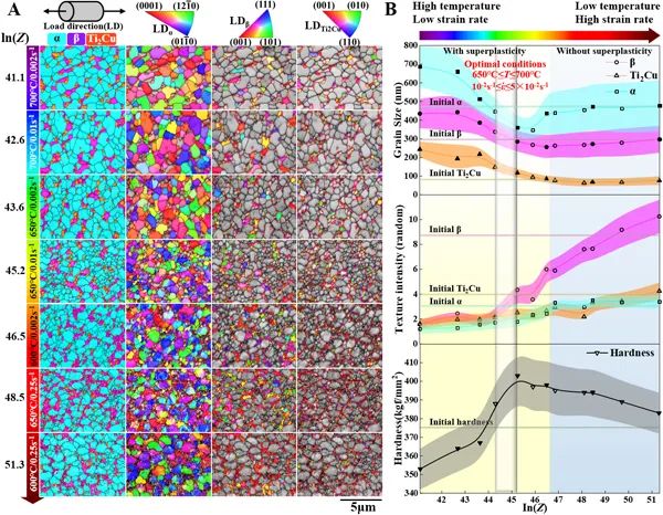 圖4. 多相納米網狀Ti6Al4V5Cu合金超塑性變形后的組織。(A)變形后的EBSD分析。(B)變形后的晶粒尺寸、織構強度、維氏硬度隨lnZ參數的變化。