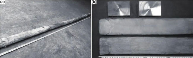 TiAl合金鑄態組織塑性較低,通過鍛造、擠壓和軋制等熱加工,可以有效細化組織并降低成分偏析程度,提升合金的綜合力學性能。采用普通的鐓拔工藝無法進行坯料大變形量的改鍛,為此北京航空材料研究院嘗試采用包套熱擠壓工藝進行TiAl合金的高溫變形,當擠壓溫度為1200~1300℃時,包套材料可選用304不銹鋼;擠壓溫度大于1300℃時,包套材料可選用Ti-6Al-4V或工業純鈦。采用包套熱擠壓工藝成功地將Ф220mm錠坯一次擠壓成Ф60mm圓棒,擠壓比約為10,棒材長度達2.5m,組織均勻細小,如圖6(a)所示。為了適應TiAl合金葉片模鍛需求,研究了TiAl合金矩形截面棒材的擠壓工藝,成功地制備了TiAl合金方棒,如圖6(b)所示。