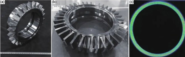 國外在SiCf/Ti復合材料研發及應用方面取得了較大進展,如美國Textron公司采用Ti-1100鈦合金作為基材制造SiCf/Ti復合材料整體葉環,使用溫度可以達到700~800℃,結構質量減輕50%。國內開展了鈦基復合材料環形件、板材、轉動軸部件的研制。針對復合材料板材,成型后會發生變形,應力調控成為難點。整體葉環回轉體結構成型過程容易發生整體斷裂,需要綜合考慮結構、纏繞、成型等多方面因素。通過多年的技術攻關,解決了整體葉環制備過程中復合材料斷裂的問題,制備了整體葉環試驗件,如圖9所示。復合材料構件使用還需要開展如下研究工作:(1)材料的穩定性仍需提高;(2)復合材料力學性能數據測試;(3)整體葉環性能表征;(4)失效機理及壽命預測;(5)無損探傷微觀尺度的檢測;(6)加工過程復合材料與整體葉環同心精確控制;(7)制定設計準則及考核驗證。需要在纖維材料、基體材料以及高溫抗氧化涂層,批次穩定性,生產效率,工藝標準、材料制件規范等方面加強研究,逐步解決和完善鈦基復合材料制備、使用過程中出現的問題。