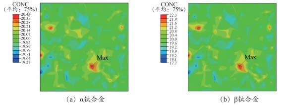 (4)β鈦合金和α鈦合金微結(jié)構(gòu)的應力分布狀態(tài)和氫濃度分布狀態(tài)基本一致。β鈦合金微結(jié)構(gòu)中的最大Mises應力值和應力集中系數(shù)均高于α鈦合金的,且β鈦合金微結(jié)構(gòu)中的最大氫濃度值也高于α鈦合金的。因此β鈦合金比α鈦合金更容易發(fā)生因應力集中而導致的材料斷裂失效問題和因局部區(qū)域氫濃度上升而發(fā)生的氫致開裂現(xiàn)象。