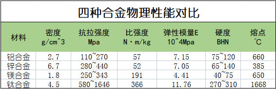 這四種合金,鈦合金最硬,強度也最高。硬度方面,鈦合金要遠硬于其他三種合金。就抗拉強度而言,鈦合金強于鋅合金,其次是鎂合金,強度最低的是鋁合金。