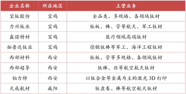 目前,陜西省已形成了以寶鈦集團、西北有色金屬研究院(西部材料、西部超導)為產業龍頭,以寶雞地區力興鈦業為首的多家民營企業組成的寶雞-西安鈦金屬產業基地。寶雞市聚集了以寶鈦集團為龍頭,以力興鈦業、鑫諾特材、拓普達鈦業等企業為骨干的科研、生產、加工、貿易和流通等各類企業。西安則聚集了以西部材料、西部超導為代表的多家鈦材研發生產企業及以鉑力特為代表的多家金屬3D打印(增材制造)企業。