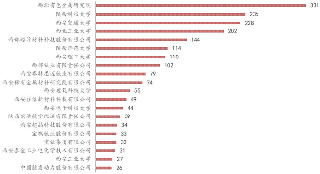 截至2023年6月30日,陜西省鈦合金專利共3885項,其中西安以2616項位列第一,寶雞市以1098項位列第二,咸陽市以114項排名第3。從陜西省單個申請機構的專利數量來看(除高校和研究院所外),西部超導、西部鈦業和賽特思邁鈦業遙遙領先,表明企業研發投入大。